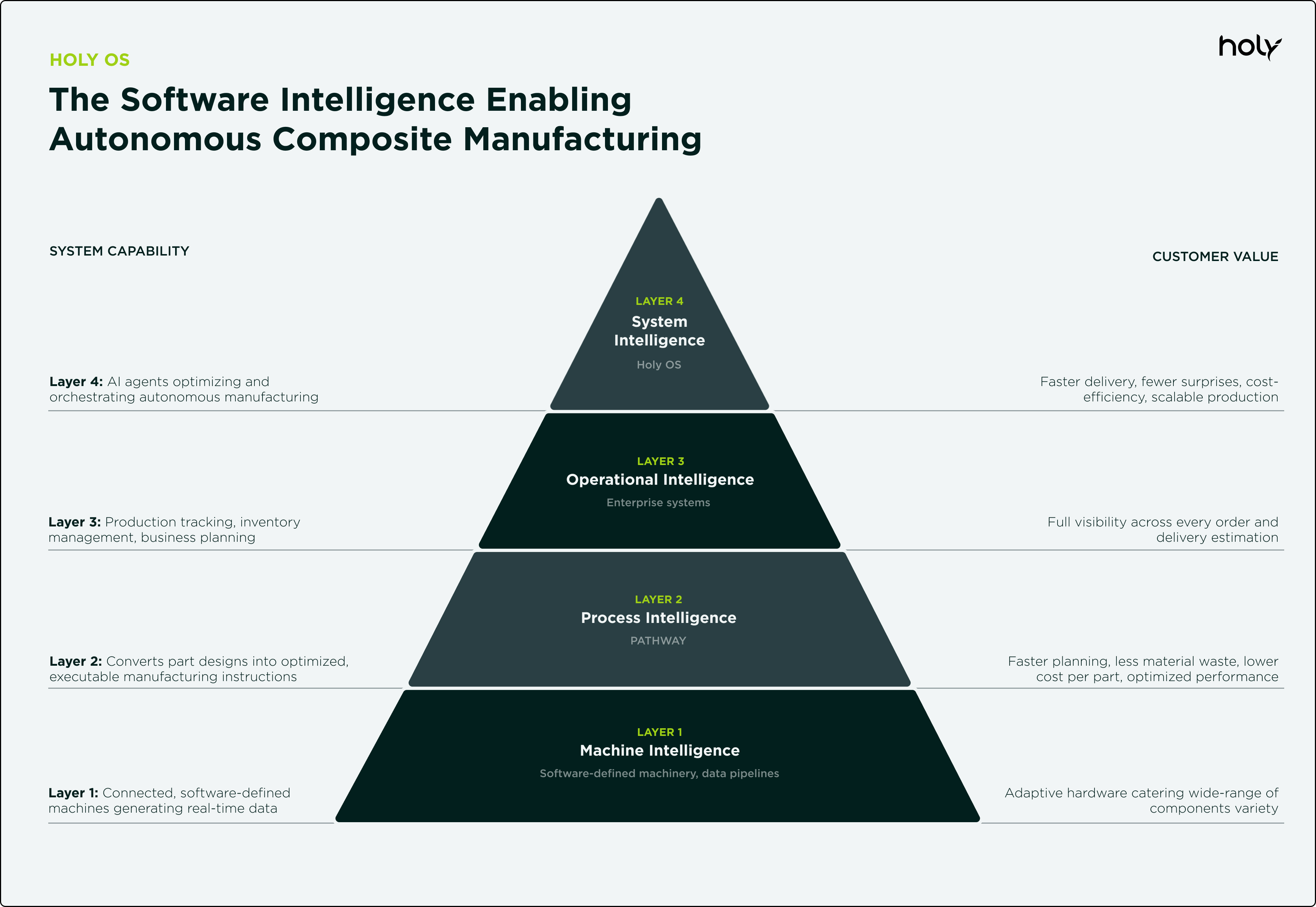 Autonomous composite manufacturing requires hierarchical architecture at four distinct layers (Figure 2). Each builds on the next, with intelligence and decision-making authority increasing as you move up the stack. Holy OS is at the top layer and acts as the operating system, orchestrating the entire system and enabling autonomous operation.